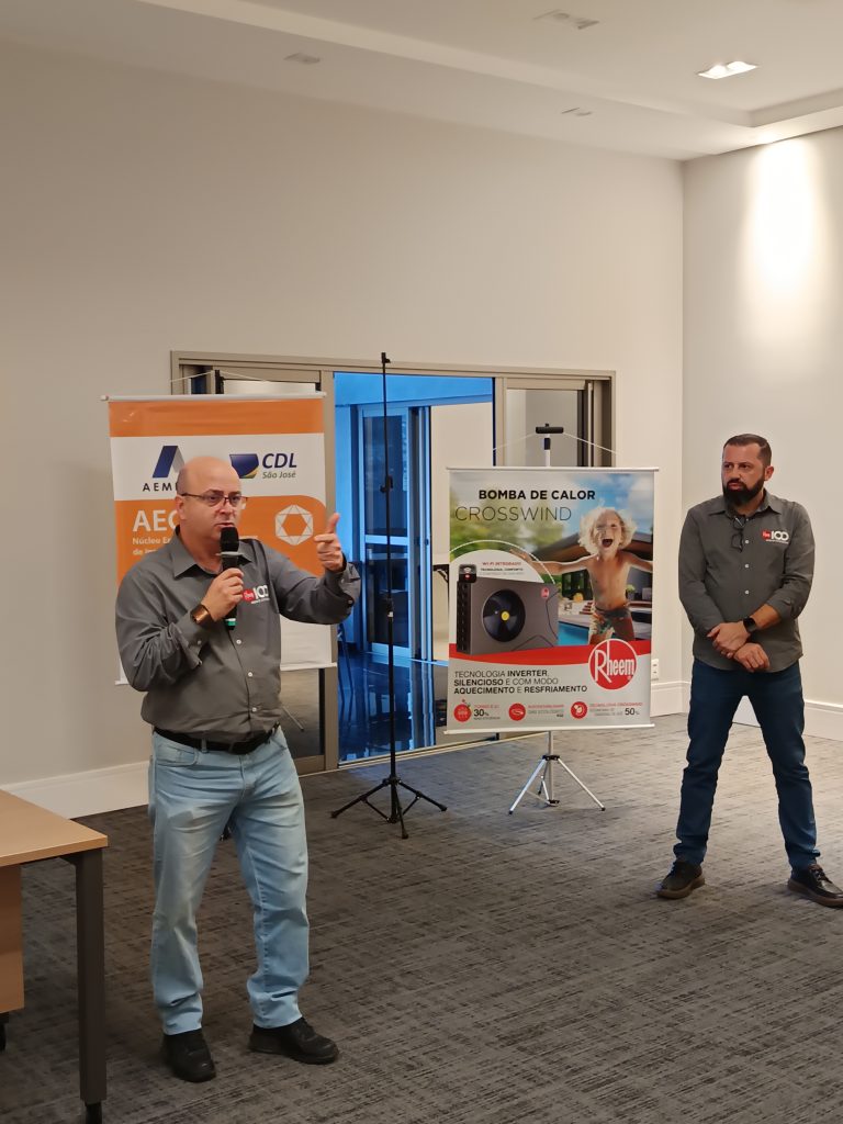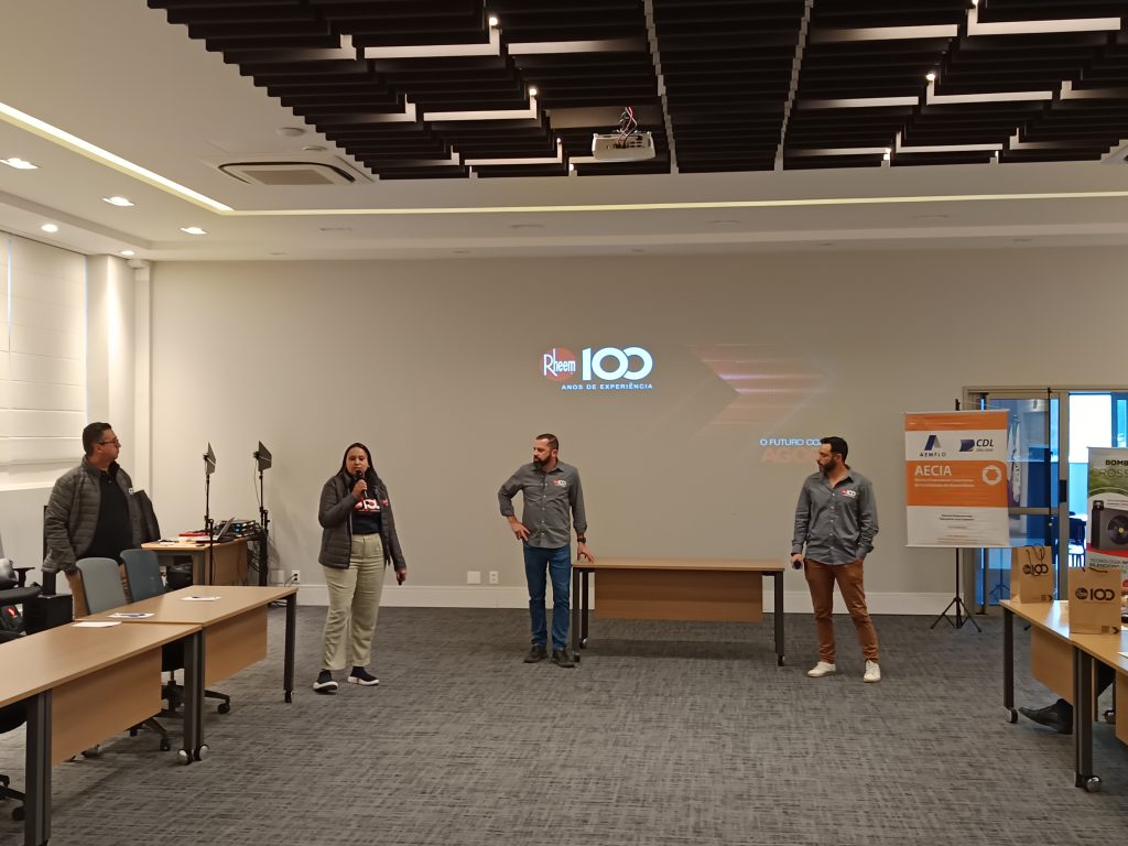 O encontro também contou com duas apresentações técnicas: uma da Rheem e outra da Acqua Cover. Pela Rheem, participaram Danilo Vale (Gerente Nacional de Negócios), Nayane Araújo (Líder de Marketing e Trade), Geovane Bronzato Amaral (Coordenador Comercial Sul) e o representante comercial Antônio Pires Neto. A empresa apresentou suas soluções em aquecimento de água, com destaque para bombas de calor com tecnologia EVI, controle Wi-Fi integrado e sistemas de alta eficiência energética. Também abordou tendências do setor e a importância da qualificação profissional.