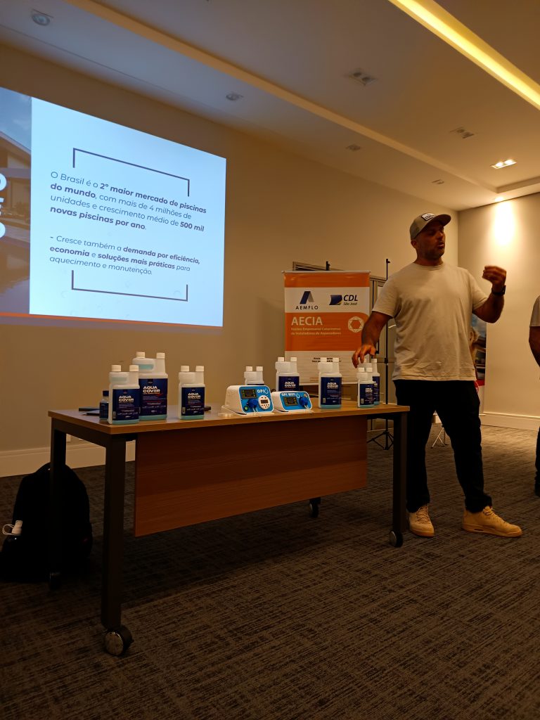 Na sequência, a Acqua Cover apresentou sua Capa Térmica Líquida, um produto inovador para piscinas que reduz a evaporação, conserva a temperatura da água e gera economia de energia e recursos. A solução possui aplicações residenciais, comerciais e automatizadas. A empresa esteve representada por Adriano de Oliveira Cláudio e seu sócio, André Helal de Paula.